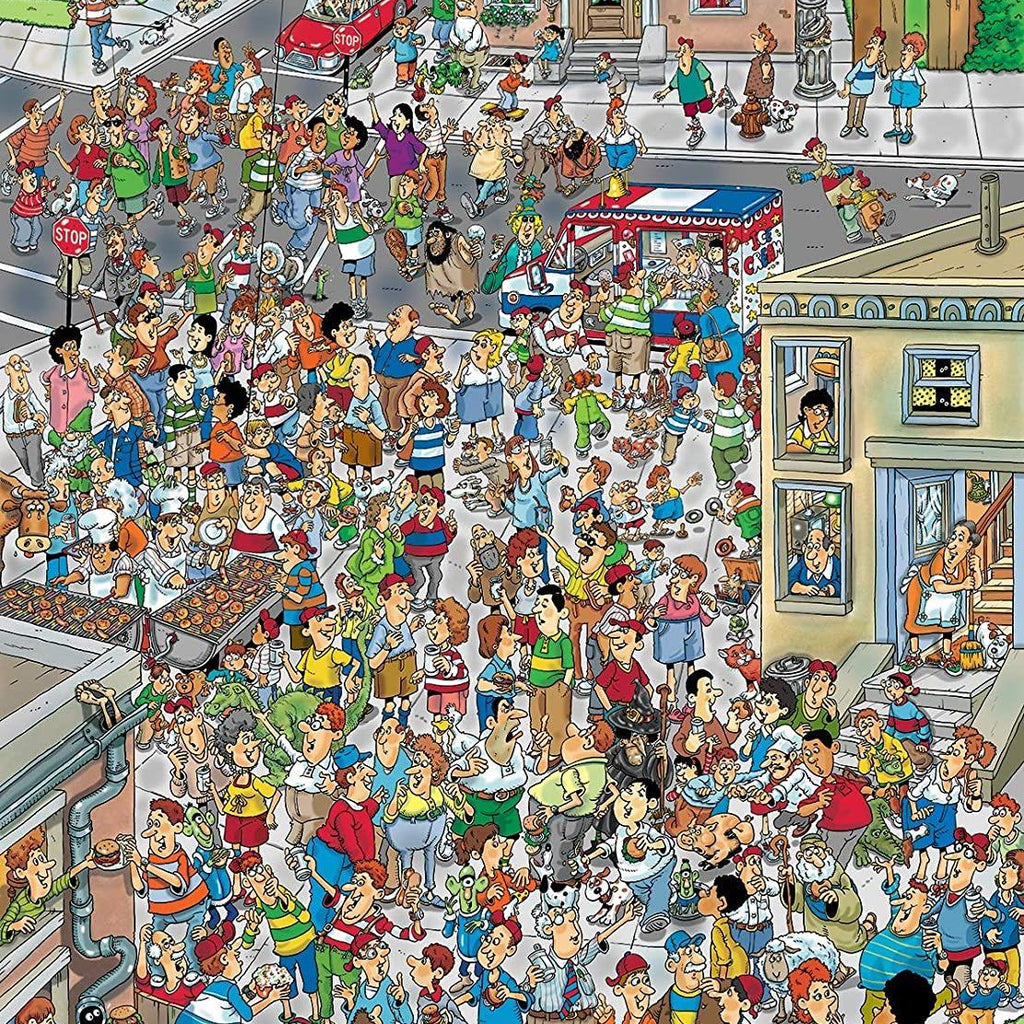 In this very amusing scene, residents of this neighbourhood are enjoying a bloc party but there are some funny things happening within the midst of it! The BBQ is fired up, cooking sizzling sausages and tasty burgers, an ice-cream truck has arrived for dessert and everyone looks to be having a great time! But there are some funny characters who have decided to join in with the fun, including a caveman, a green bird (who is in the process of stealing someone's hat), a few aliens from outer-space and a penguin that's stolen a hot dog.
