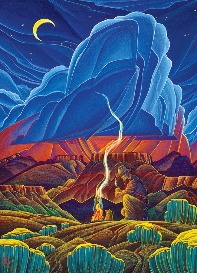 The cowboy has set up for an All Nighter out under the moon and stars. A campfire burns slowly, offering enough warmth to heat up a kettle of coffee. It's a colourful night with the deep blue sky and the vibrant glow of the red mesa in the near distance. This is going to be a long and beautiful night somewhere in Santa Fe.