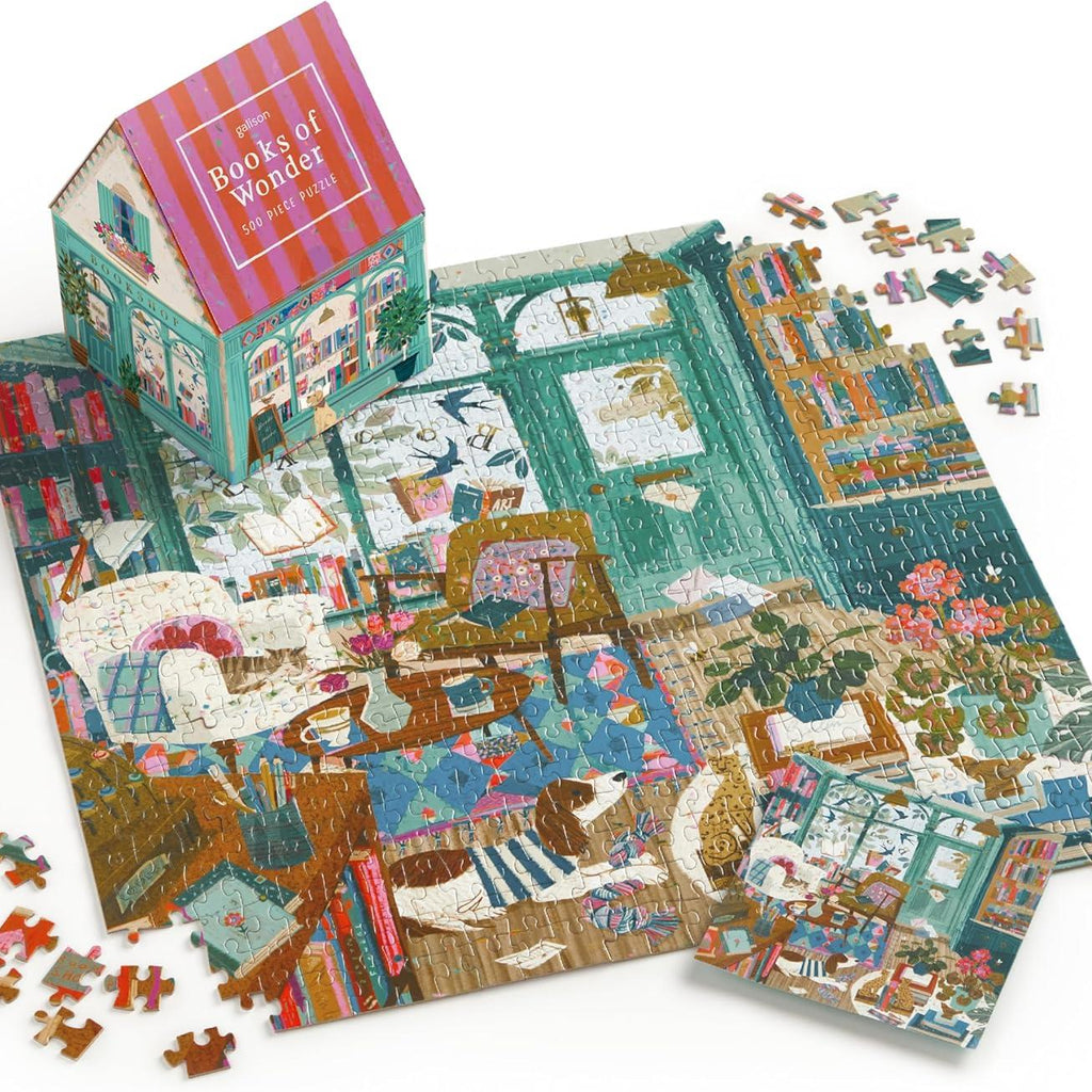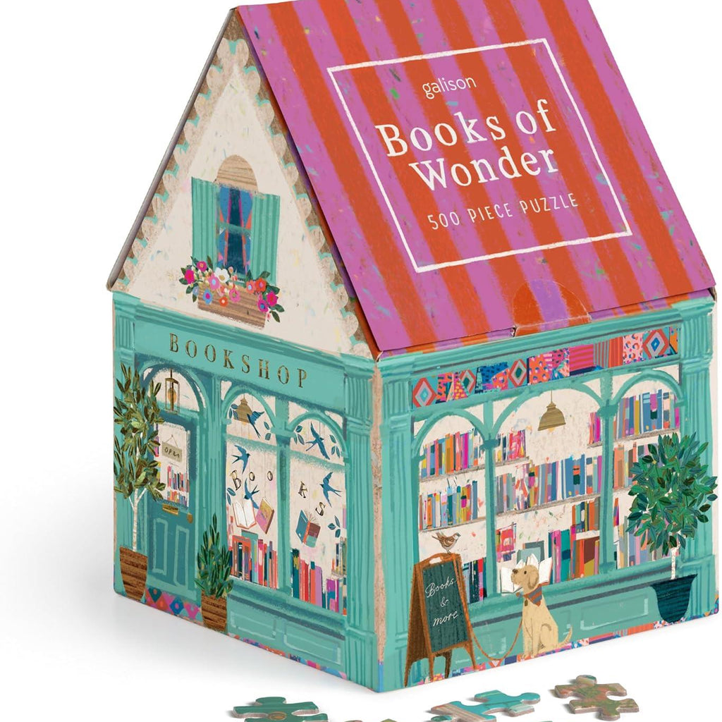 Books of Wonder is a quality 500-piece jigsaw puzzle by Galison in a house-shaped box