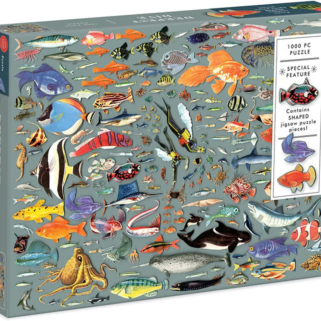 This unique puzzle includes 20 puzzle pieces that are die-cut in the shape of fish and sea creatures.