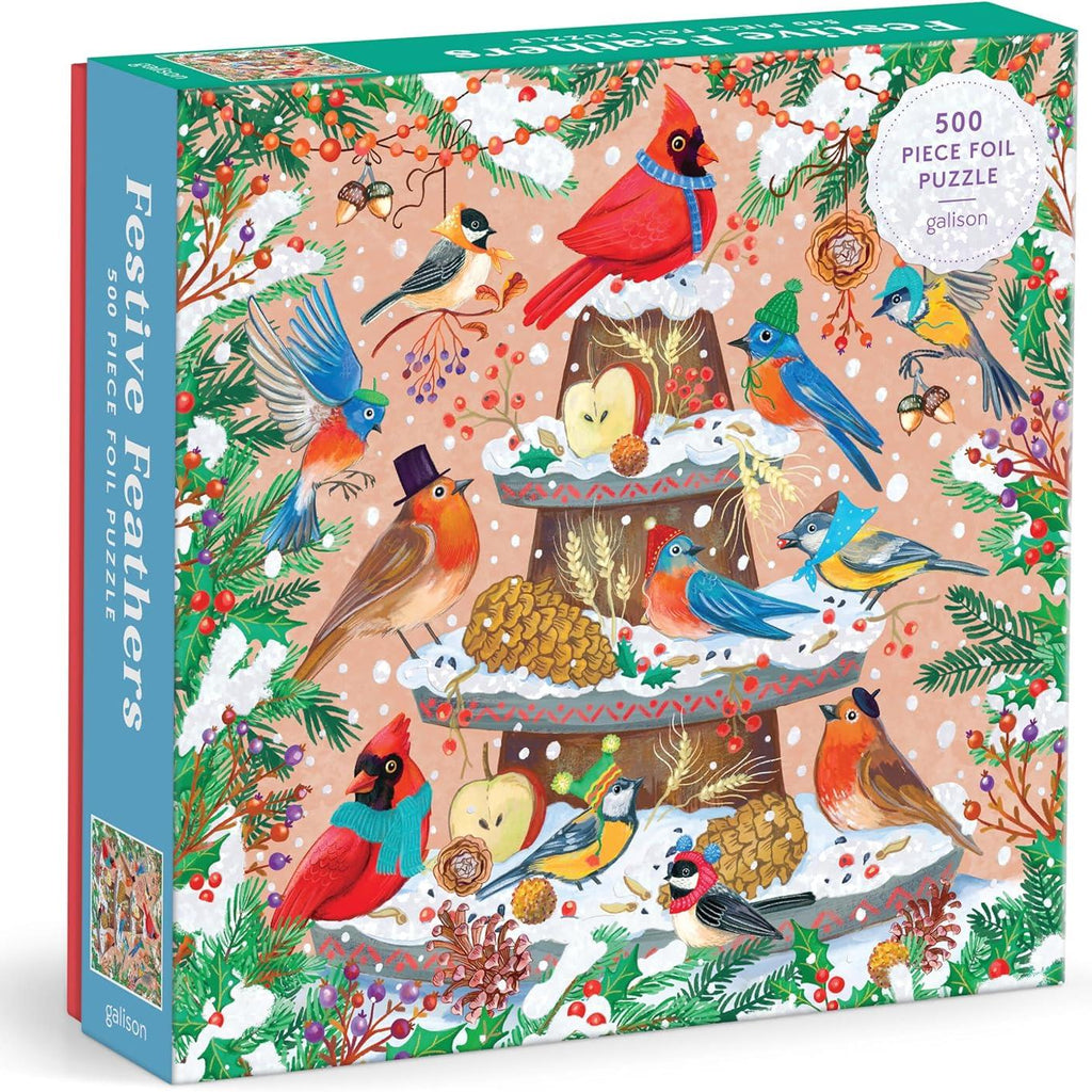 Festive Feathers is a quality 500-piece foil jigsaw puzzle by Galison.