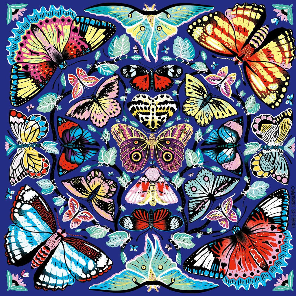 Kaleido-Butterflies jigsaw puzzle features a gorgeous illustration of colorful butterflies arranged in a pattern inspired by the dazzling view through a kaleidoscope.