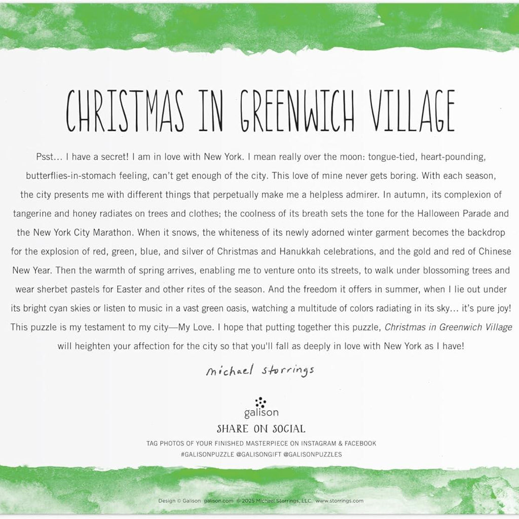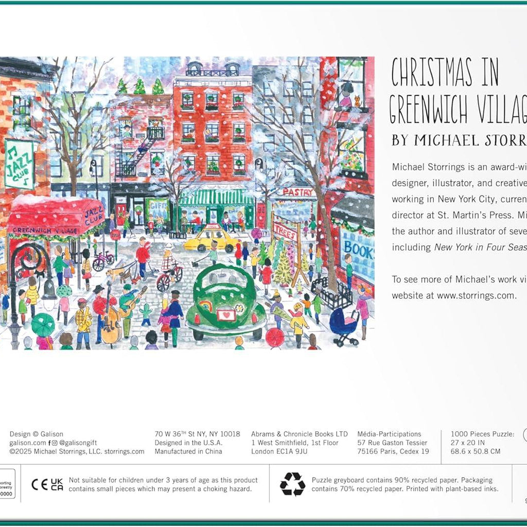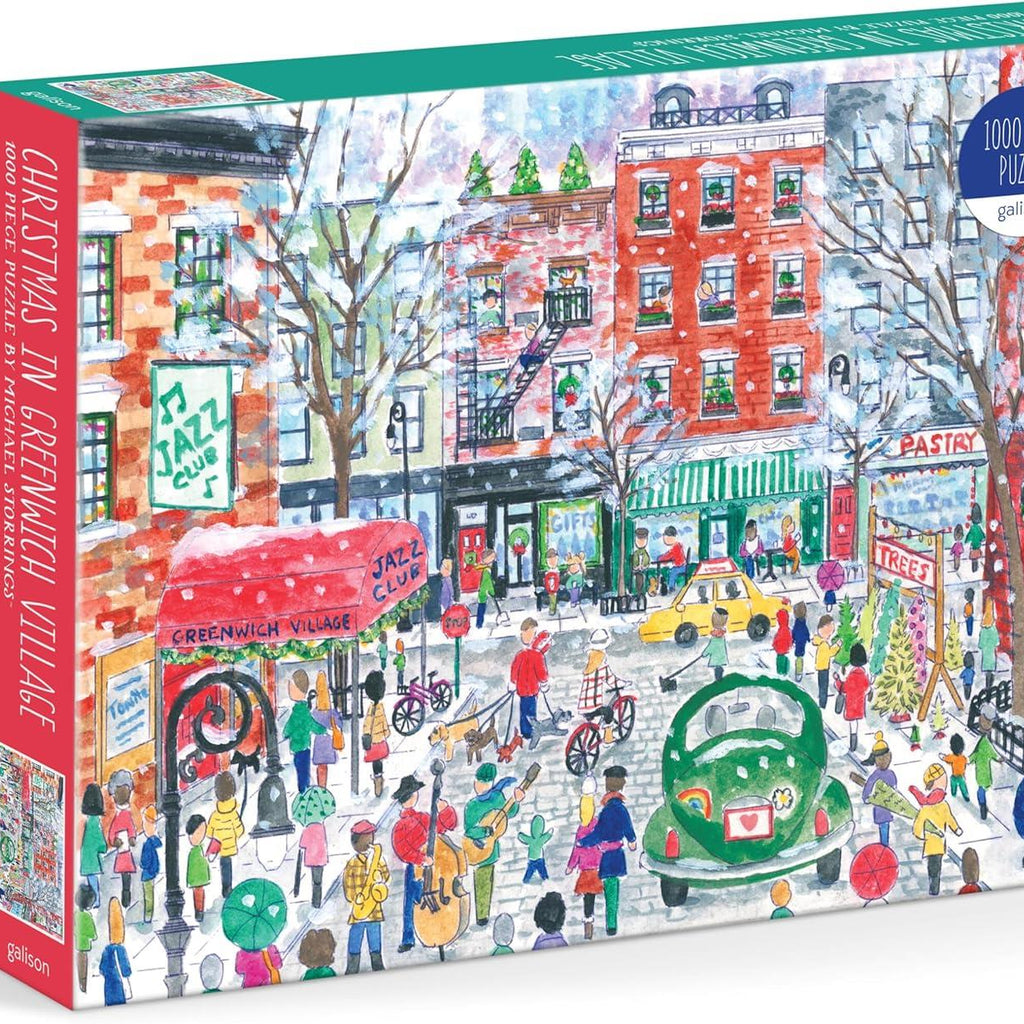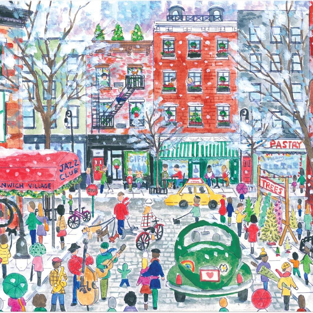 Christmas in Greenwich Village is a quality 1000-piece jigsaw puzzle from Galison's Michael Storrings Collection.