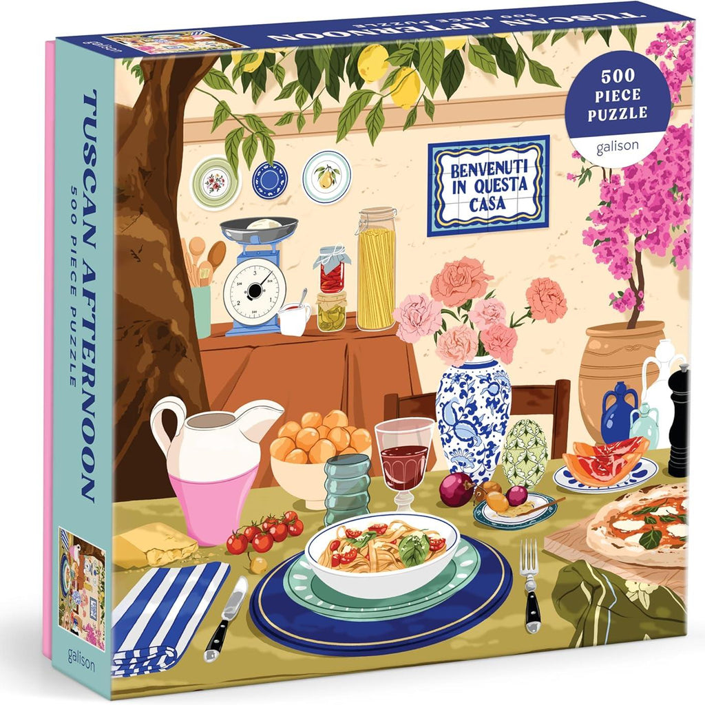 Transport yourself to the picturesque landscapes of Tuscany with Galison's delightful 500-piece puzzle featuring artwork of a Tuscan-themed dining table adorned with delectable Italian food. Each piece of this puzzle invites you to savor the rustic charm and culinary delights of an Italian feast amidst the rolling hills and vineyards of Tuscany