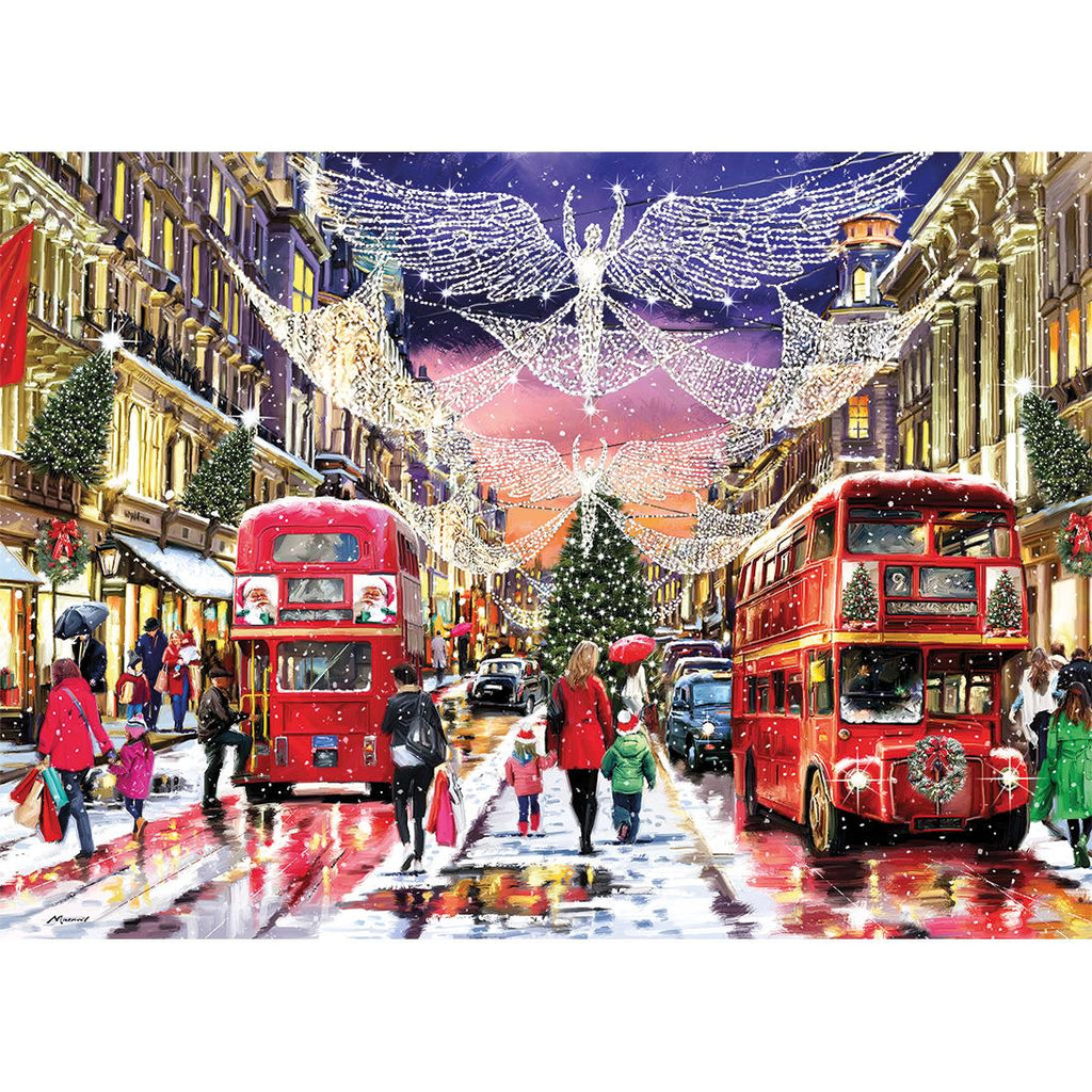 Experience the Christmas magic of London in this beautiful festive 500 XL puzzle by Richard Macneil. The lights on Regent Street at Christmas are a sight to see. Twinkling lights adorn the streets as shoppers race to get their shopping finished!