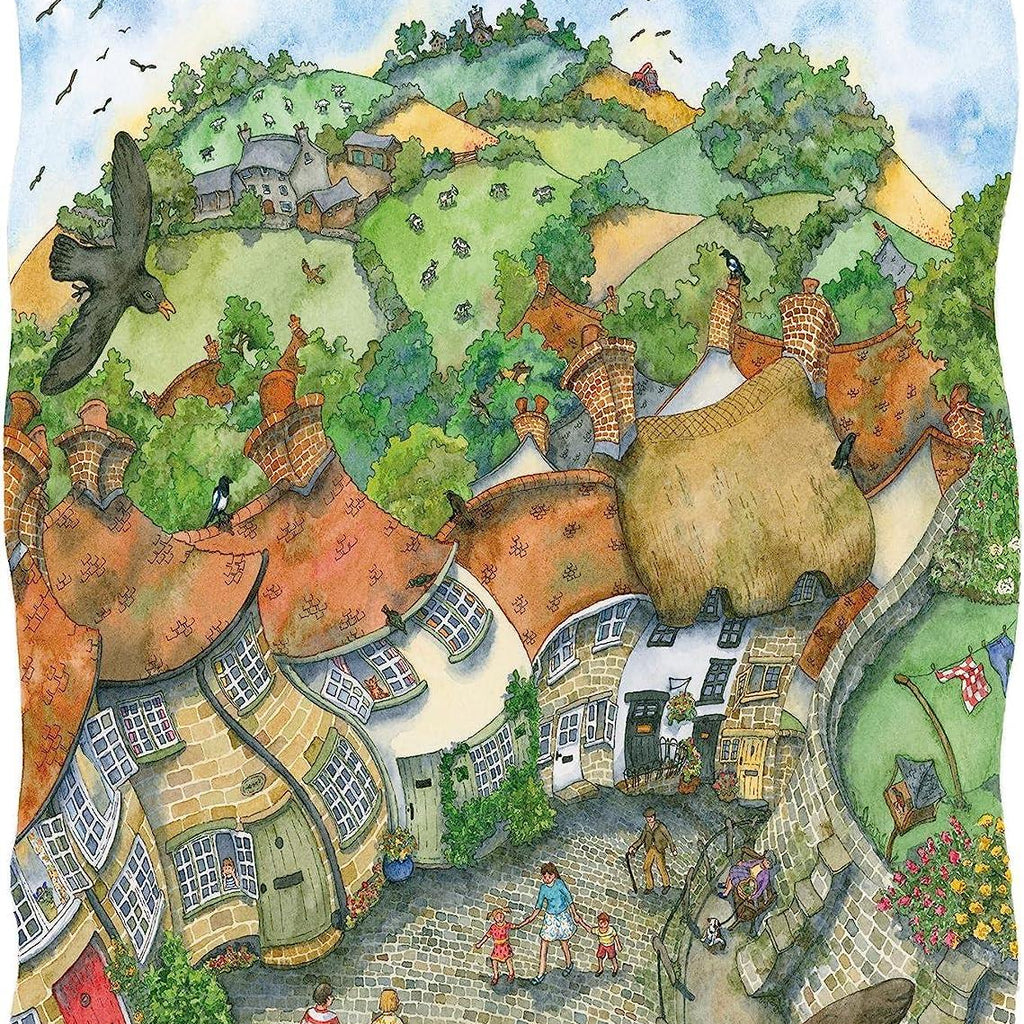 Step in to this twisty, topsy turvy Gold Hill jigsaw puzzle created by the very talented artist, Wendy Brown. Gold Hill, Shaftesbury, in Dorset is England's most famous hill. It has breathtaking views and is well known for being featured in the Hovis advert. Wendy captures the rolling hills and cobbled street perfectly in this colourful and detailed design