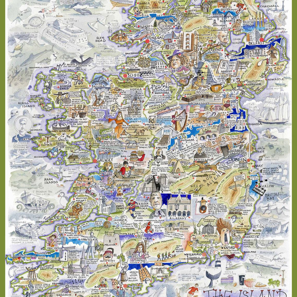 You will be amazed at what you find within this wonderfully detailed map of the beautiful country of Ireland. From the Aran Islands to Dublin, you will find all kinds of facts and fascinating illustrations about Ireland. Including the oldest bridge in Ireland built in 1330, the international opera festival and the mountains of Antrim. What will you discover in this beautiful illustration of Ireland?