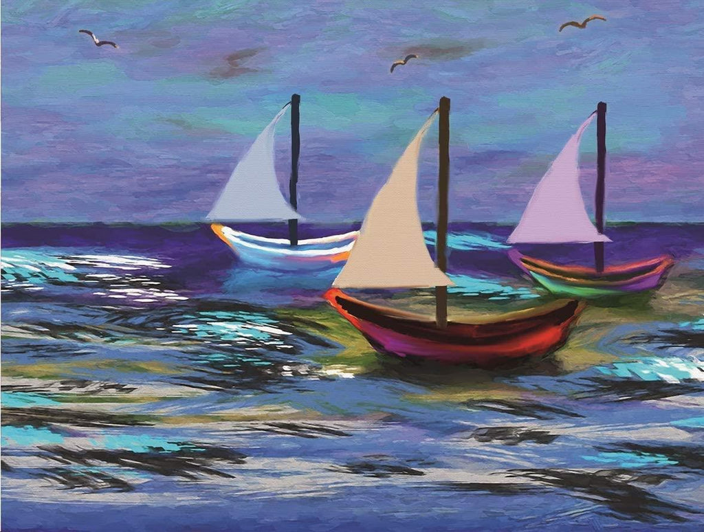 This colourful watercolour painting of boats is very vivid and striking! On the peaceful water, three little sailing boats bob along the waves, with seagulls flying above. You can find every colour of the rainbow beautifully within this stunning image