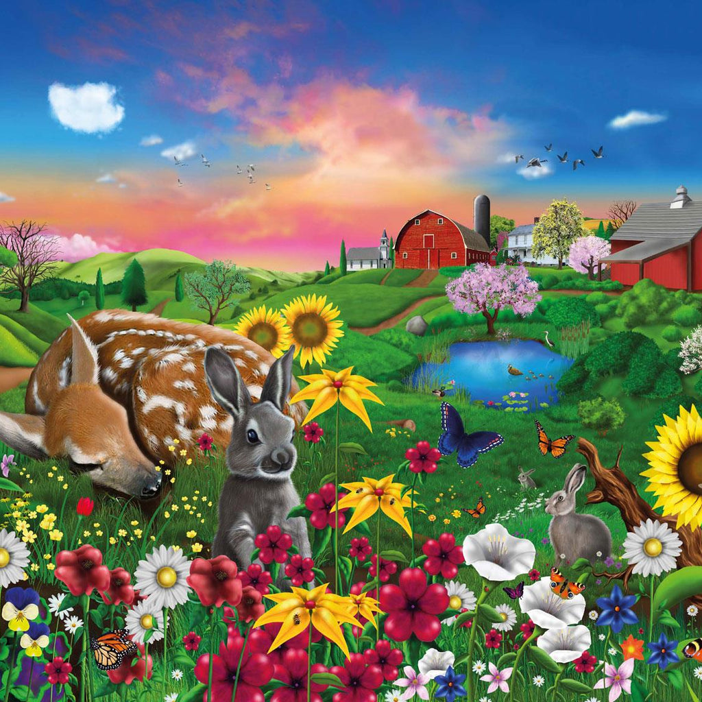It's spring and this colourful and vibrant picture shows that beautiful farmland has blossomed with the most gorgeous flowers! An adorable fawn and some cute bunny rabbits are enjoying the warmer weather and the amazing flora and fauna around them.