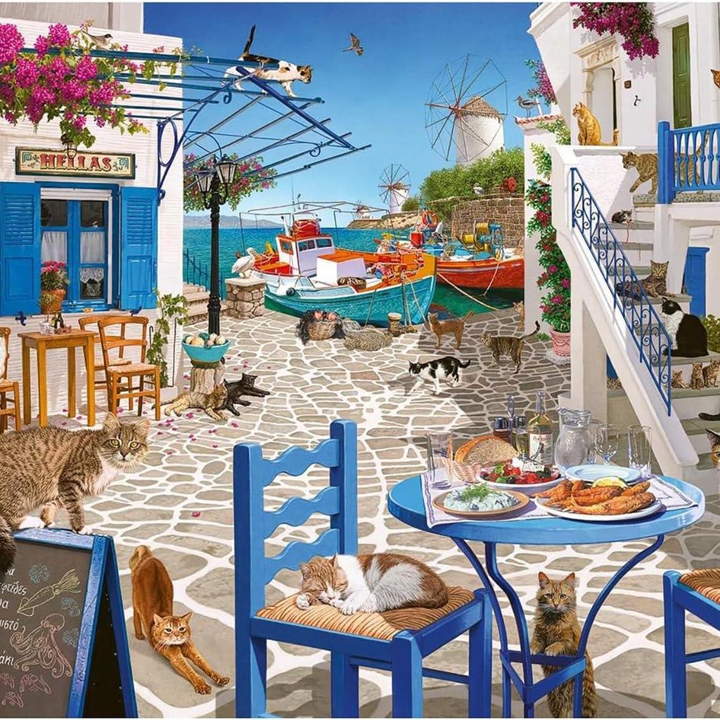 Cats of Mykonos is a premium quality 1500-piece cardboard jigsaw puzzle from Ravensburger.