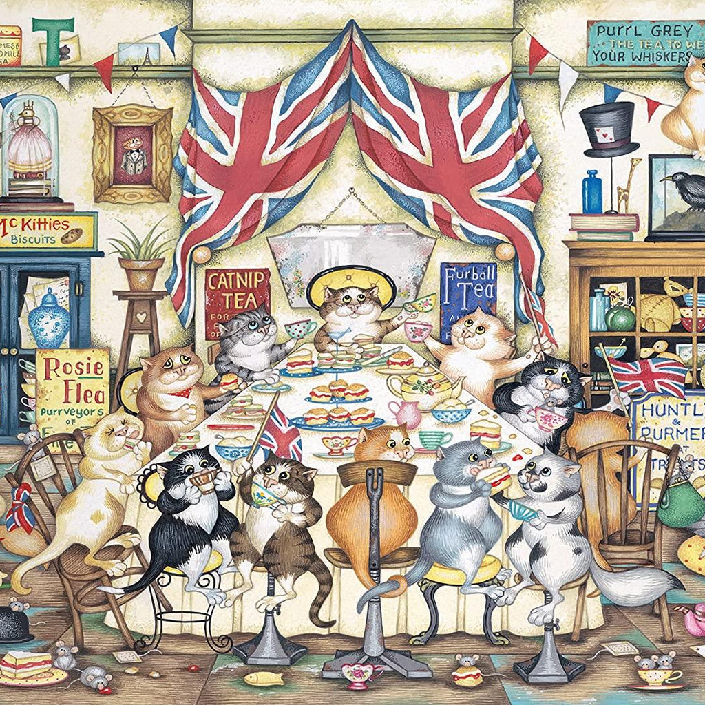 Crazy Cats Afternoon at Tiddles is a high quality 1000 piece cardboard jigsaw puzzle from Ravensburger's Crazy Cats Vintage Collection..