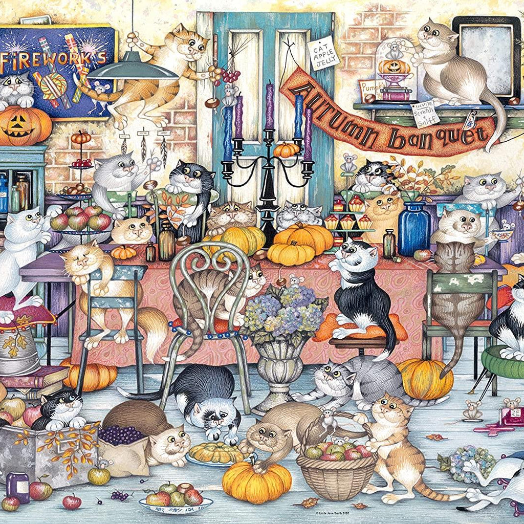 Crazy Cats Autumn Banquet is a premium quality 1000-piece cardboard jigsaw puzzle from Ravensburger's Crazy Cats Collection.