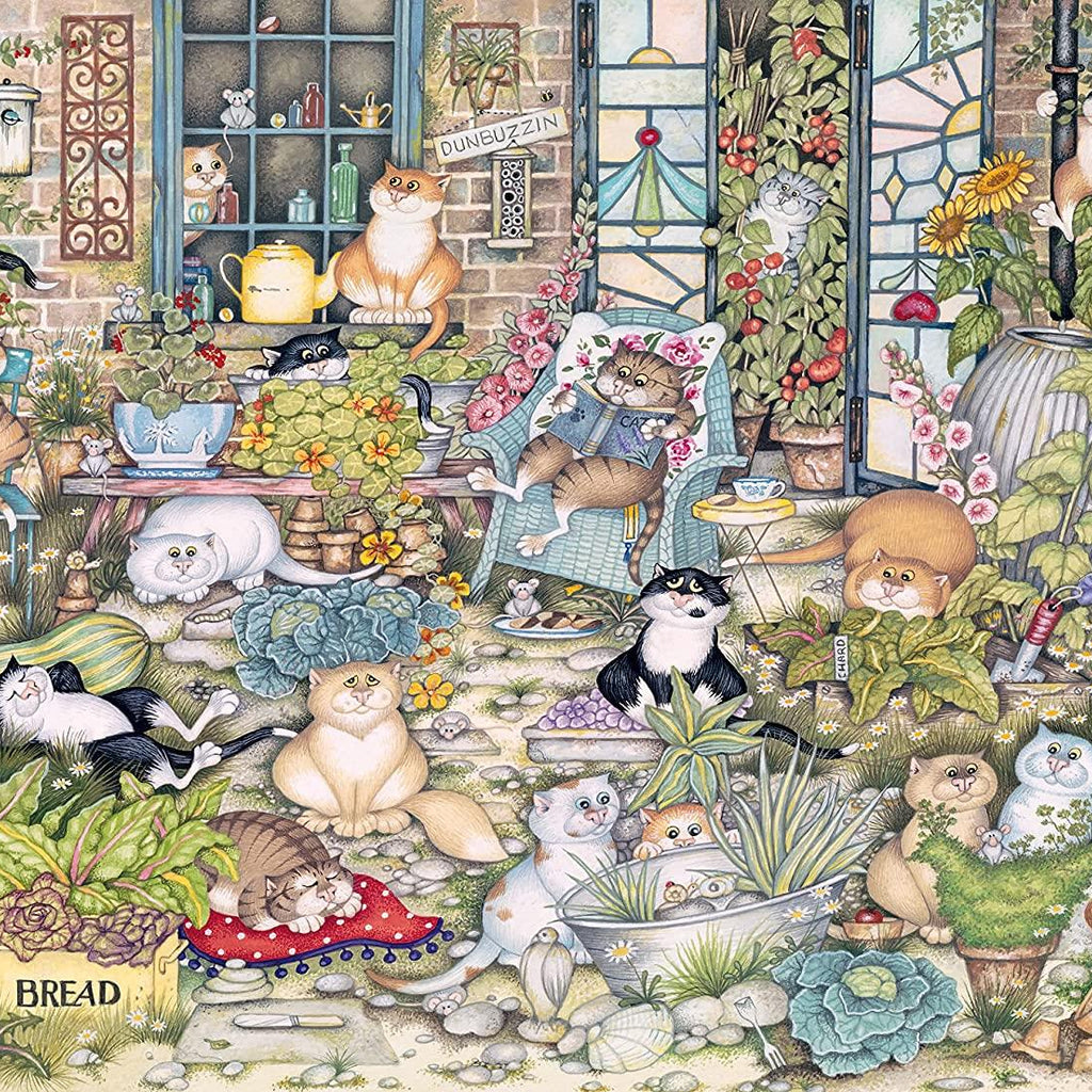The Crazy Cats relax in their colourful garden. It's time for the Crazy Cats to put their paws up and unwind. What better place than in this beautiful garden, packed with delicious veggies? Amongst the chard, tomatoes and runner beans bloom colourful hollyhocks, geraniums and nasturtiums, and the plot is alive with mice, birds and the odd snail or two. Discover beautiful vintage objects, bottles, terracotta pots ... lots of Crazy Cats on this delightfully detailed puzzle. Escape the worries of the day and enjoy some mindful moments as you enter the magical world of Crazy Cats.