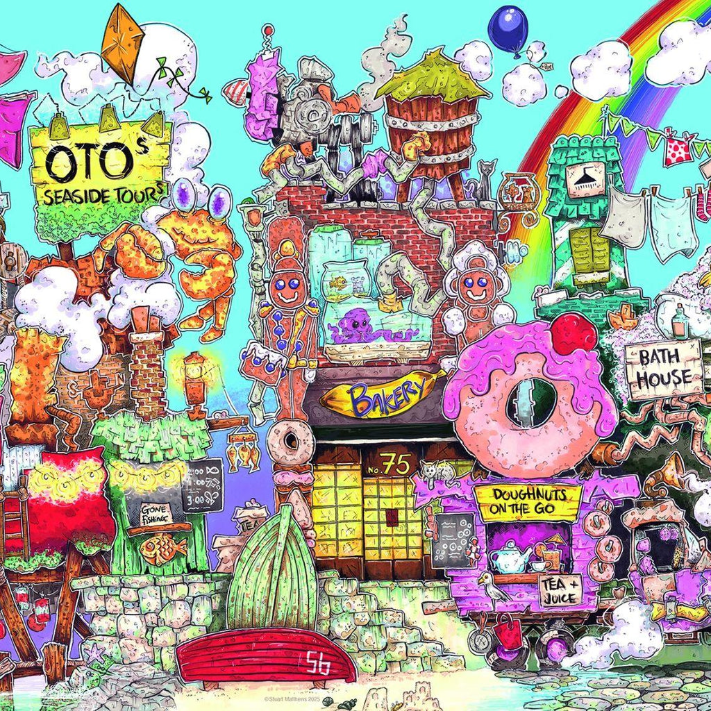 Get ready for a vibrant and whimsical journey with this lively 500-piece jigsaw puzzle. The scene is a delightful collage of buildings, colourful storefronts, and unique characters. Quirky details abound, with funky street art, creating a sense of joy and energy that captures the essence of urban life. As you piece together this fun and chaotic street scene, you'll be drawn into a world brimming with charm. Perfect for puzzle enthusiasts who enjoy lively and colourful illustrations, this puzzle promises hours of entertaining challenge and a joyful escape into a world of creativity. The first 500 piece jigsaw puzzle in a series of whimsically eccentric puzzles by Oxfordshire based artist Stuart Matthews.