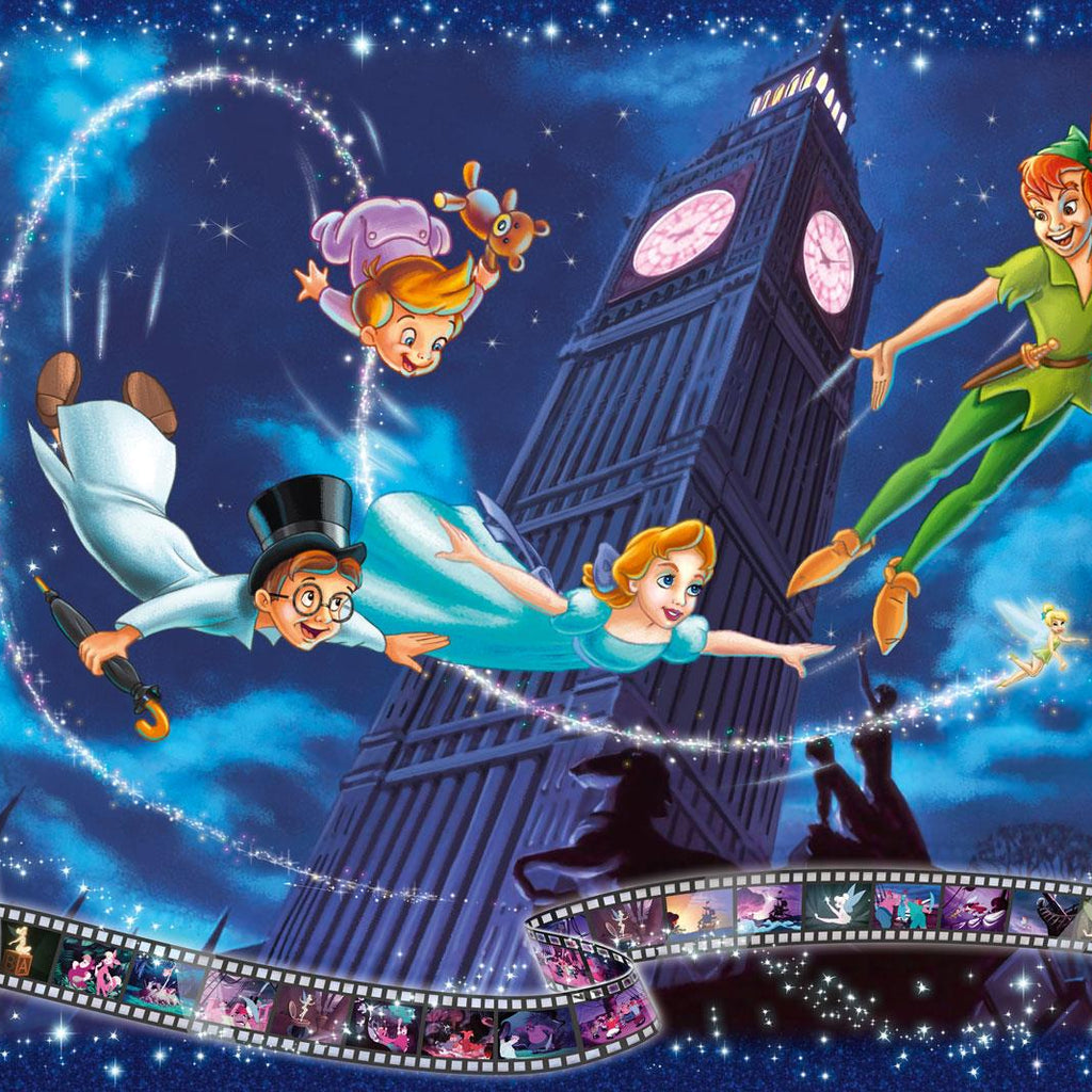 Peter Pan leads Wendy, John and Michael as they fly around London at night. They are assisted and encouraged by Tinker Bell, who darts around them, surrounding the children with magical fairy dust. The Tower of Big Ben is silhouetted against the deep blue star-studded sky and other scenes from this 1953 film are shown in a "movie reel" that winds its way around the whole scene.