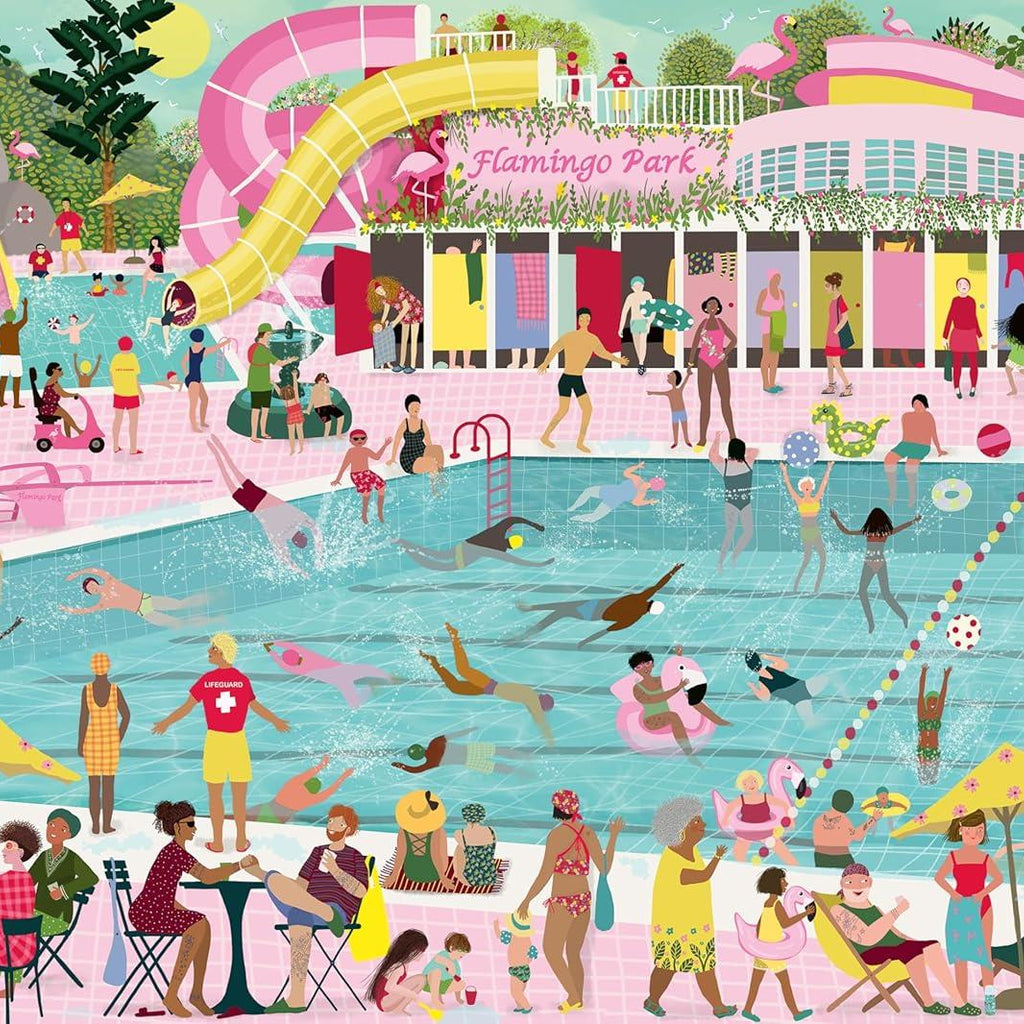 Flamingo Park transports you to a bustling scene where swimming pools sparkle under the sun. In the pools, people of all ages enjoy swimming and splashing around, while attentive lifeguards keep watch from their posts. Alongside the pools, colourful water slides add an extra dash of excitement. At poolside tables, families and friends gather, sipping refreshing drinks and soaking in the lively atmosphere.