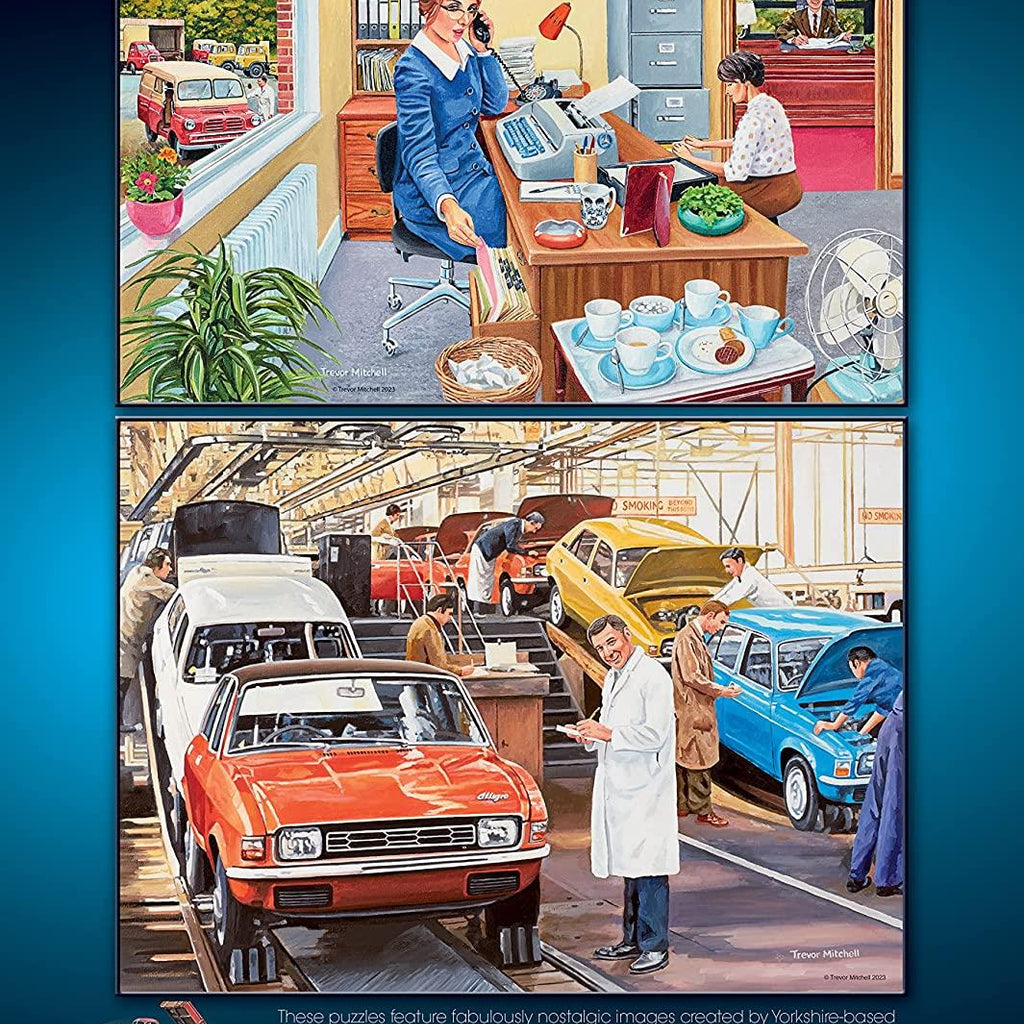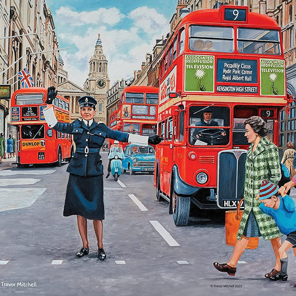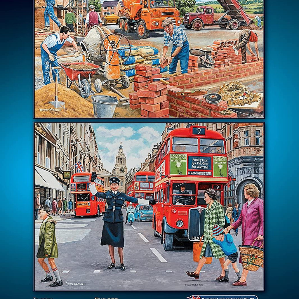 These bright and cheerful puzzles take you back to the world of work in the 1960s and 1970s. The Secretary takes us into office life, when shorthand was essential and an electric typewriter was state-of-the-art. The Factory Worker captures a Quality Control Inspector working at the end of a motor car production line, whilst the Builder shows the hustle and bustle involved in creating a new housing estate. Lastly, the WPC is on duty in central London, keeping traffic flowing and helping pedestrians to safely navigate the busy roads.