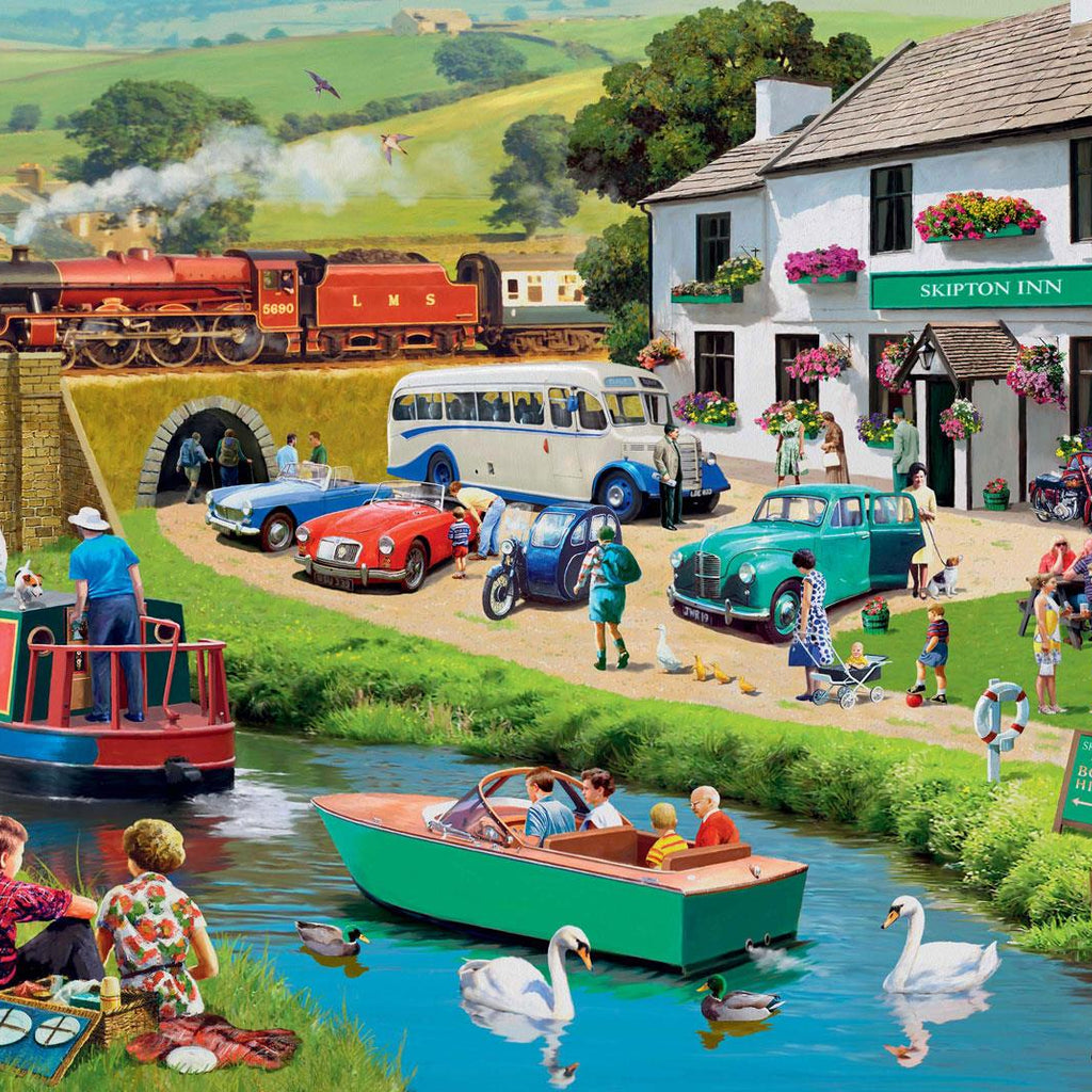 This lovely scene depicts just some of the leisure activities waiting to be discovered in the wonderful landscapes of the Yorkshire Dales. You might choose to enjoy a good walk, take your motorbike or car out for a run, enjoy a meal at a country pub, hop on board a boat or even enjoy the magic of a steam train.