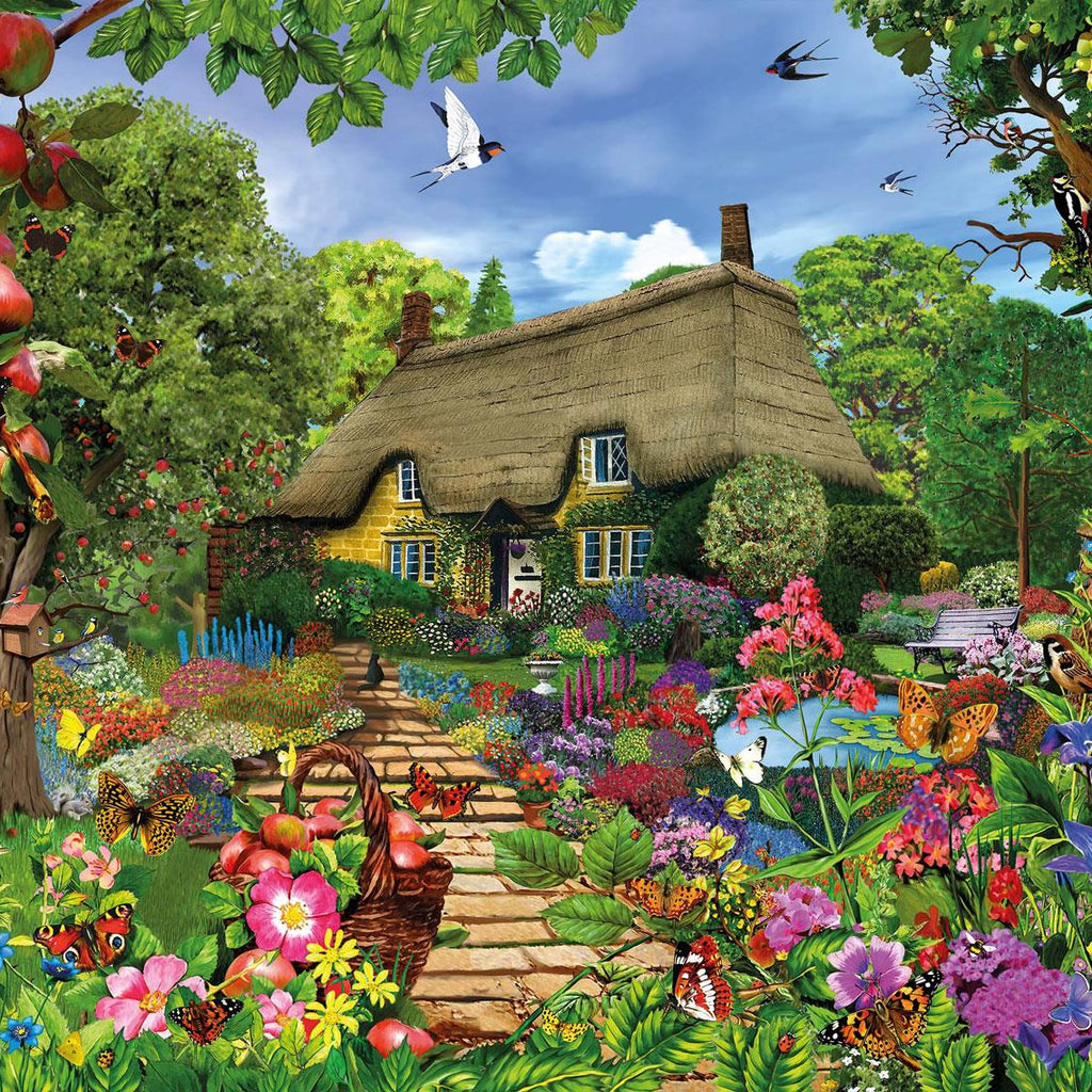 Pick a shiny red apple from the tree in the garden of this bright and colourful cottage garden jigsaw puzzle. Featuring a charming thatched cottage and an absolutely stunning garden bursting with flowers and wildlife, you are sure to enjoy puzzling this lovely image.