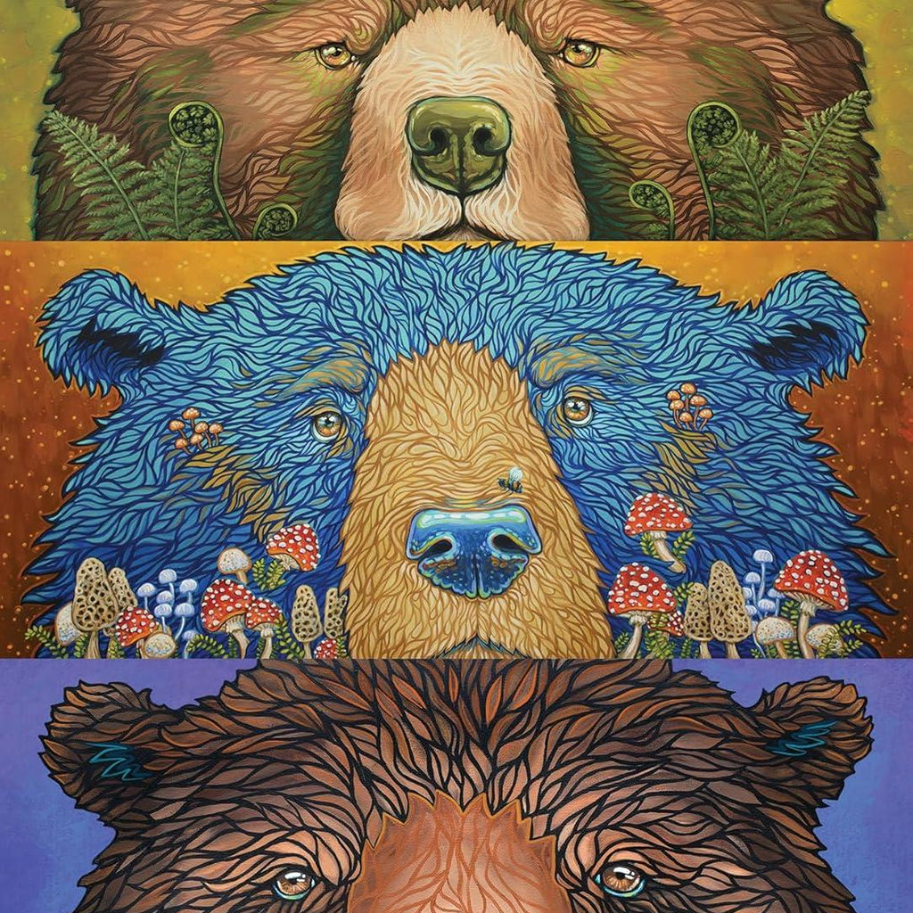 Alaskan artist Amanda Rose Warren enjoys recording the flora and fauna of Alaska in vivid colors with whimsical touches. Amanda has her own gallery space in Anchorage and offers prints, stickers, bags, original paintings, and now puzzles! Bear Eyes: Harvest is a fun trio of furry faces that stare at you with pensive, questionable, and thoughtful eyes. Explore the different expressions and textures in each bear vignette decorated with foliage and mushrooms.