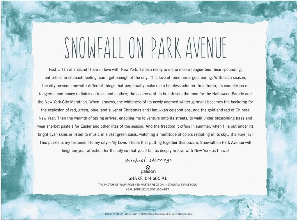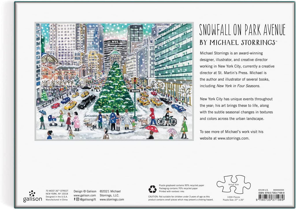 Snowfall on Park Avenue is a quality 1000-piece jigsaw puzzle from Galison's Michael Storrings Collection.