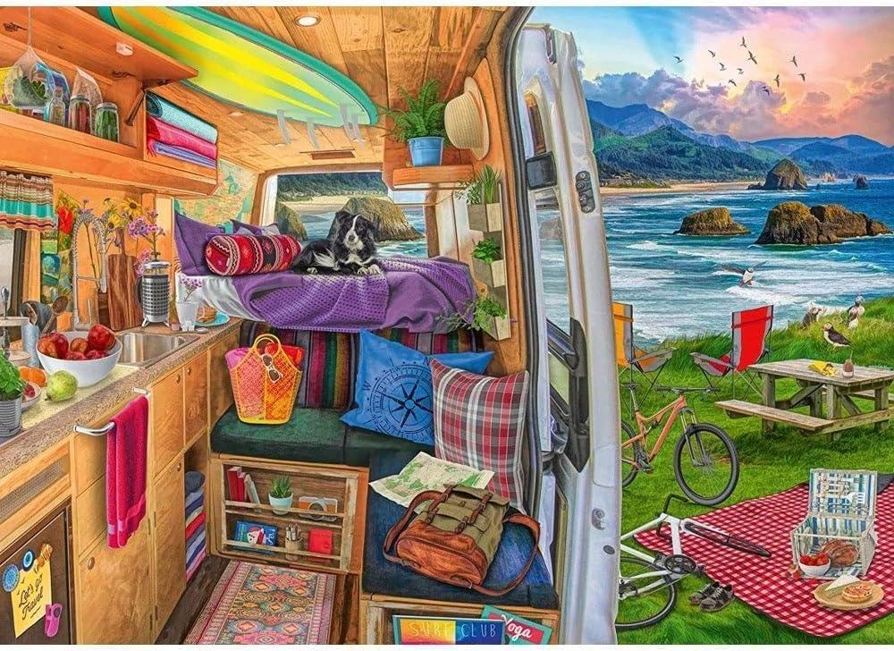 Escape to the great outdoors with Rig Views, a stunning jigsaw puzzle that captures the magic of van life. Set inside a cosy campervan, this breathtaking scene invites you to soak in the spectacular view—rugged mountains meeting the deep blue sea, all framed by the open doors of your home on wheels. Perched on a peaceful campsite, the setting is alive with nature’s charm. Watch as playful puffins soar overhead, their distinctive beaks adding a splash of colour to the crisp coastal air. With every piece, you’ll piece together the serenity of life on the road, where adventure and tranquillity meet.