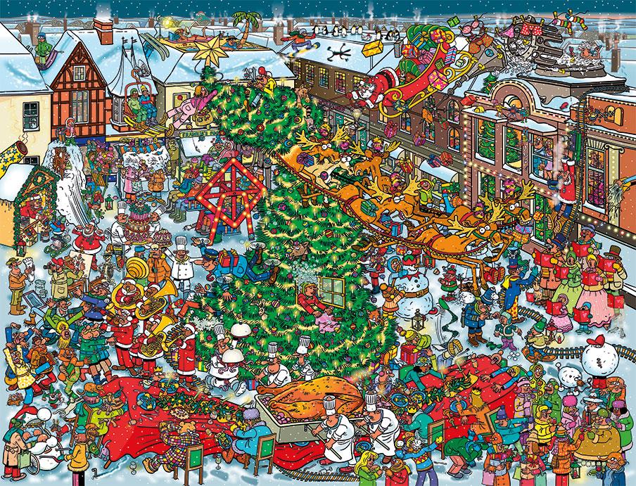 Christmas Street if full of festive fiascos. It's Christmas eve and this town square is packed full of festive folk all there to enjoy the Christmas merriment and tuck into a delicious dinner on the long and beautifully decorated table with their neighbours. But it's certainly not going to plan! To feed everyone, a humongous turkey has been prepared but is far too heavy for the table, bringing the entire thing crashing down, with plates and centerpieces going everywhere! Meanwhile, Santa's reindeer are going full pelt in order to get all the presents delivered, but they‚ve tangled themselves and the reigns in the gigantic Christmas tree in the haste of it all. In this scene, you will also find urban skiers, a drone postman, and a runaway toy train!
