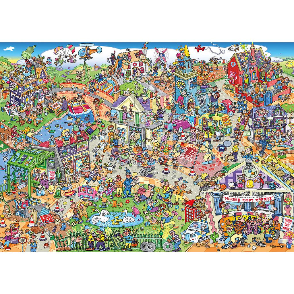 Grab your magnifying glass ready for some Jokesaw chaos in Midsummer Mayhem, a 1000 piece jigsaw by Phil Dobson. In this quaint midsummer village, all sorts of shenanigans are taking place - from prank playing to bank robbery! Among the misdemeanours, a murder most 'orrible has been committed! Can you find the guilty party hidden in plain sight, or will you be thwarted by the mayhem?