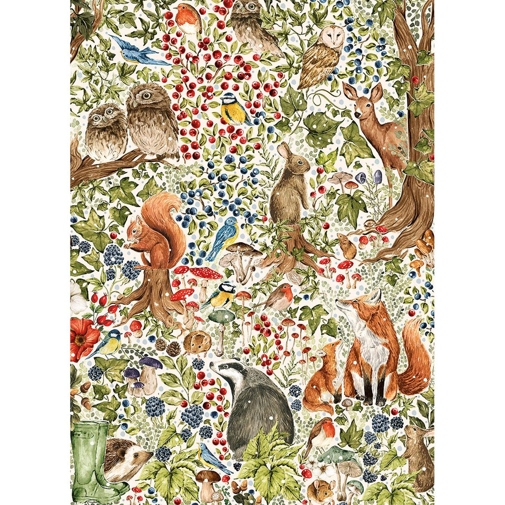Snow gently starts to patter down onto the winter thicket in this beautiful 1000 piece jigsaw puzzle by The Art File. Even in the winter, this forest floor has many bounties to keep its animals well-fed for the colder months. Chestnuts, berries and mushroom caps sprout all around, and the animals gather in this beautiful opening in the forest. Owls, robins and finches perch on branches, while a mother fox and her pup enjoy the falling snow, a wise badger contemplates the change of season and a mischievous squirrel nibbles on a nut.