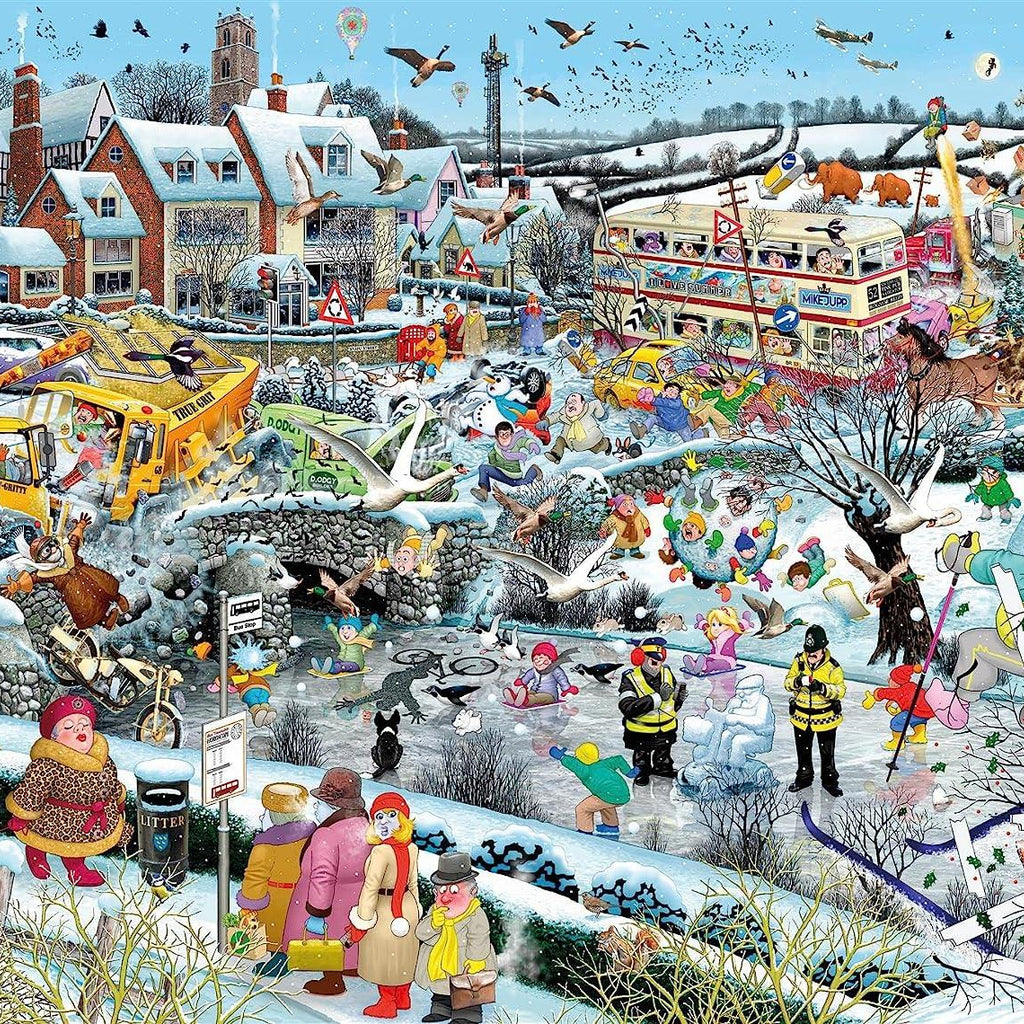 I Love Winter is a terrifically tumultuous 1000-piece jigsaw puzzle from the amazing mind of Mike Jupp. Winter has arrived in the village and with it comes chaos! The snow has fallen and the river has turned to ice, it seems that in their rush to make the roads safe the gritting trucks have collided causing havoc to all around. Can you spot a few familiar faces that Mike has dotted amongst his cast of crazy characters? Everything we love about winter has been crammed into this chaotic scene.