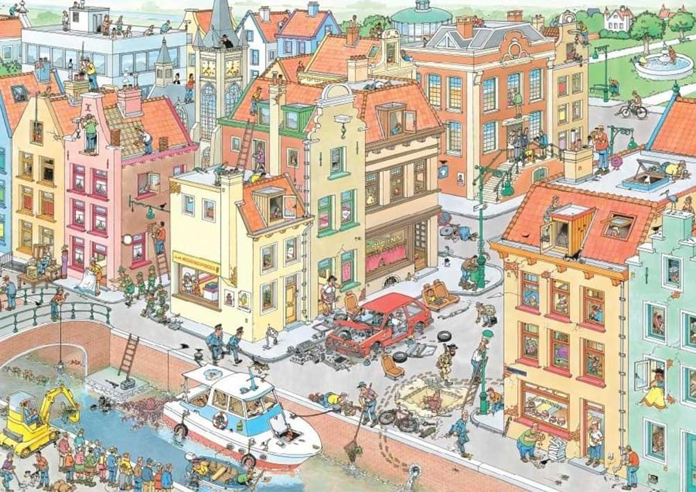 This 1000-piece Jan van Haasteren jigsaw puzzle is an ideal starter puzzle or a nice addition to loyal JVH fans collections. Most of Jan's fans will immediately search for his trademark - the shark's fin - featured in every puzzle. But you can also look for Jan's other favourites - Saint Nicholas, The Hands, The Dentures and a self-portrait of Jan - which can be seen in nearly all of his puzzles.