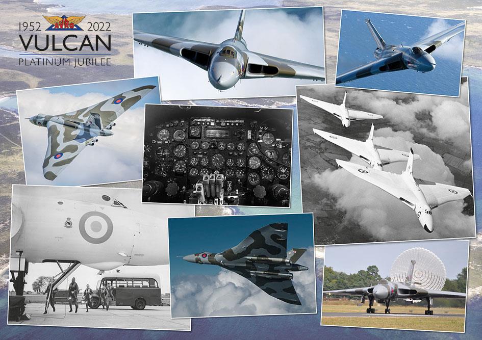 This collage celebrates the platinum jubilee of the Avro Vulcan XH558 fighter aircraft. The Avro Vulcan XH558 Spirit of Great Britain was the last remaining airworthy example of the 134 Avro Vulcan jet powered delta winged strategic nuclear bomber aircraft operated by the Royal Air Force during the Cold War. It was the last Vulcan in military service, and the last to fly at all after 1986