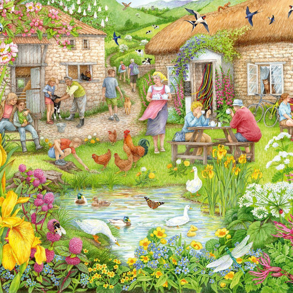 Dive into the serene charm of rural life with this enchanting 1000-piece jigsaw puzzle depicting a picturesque farm cafe nestled beside a tranquil pond. Immerse yourself in the idyllic scenery as ducks and geese gracefully glide across the shimmering water. Vibrant flowers add splashes of colour to the landscape, attracting a flurry of insects buzzing around in the warm sunlight. Atop the quaint thatched roof, a curious squirrel pauses, adding a touch of whimsy to the scene.