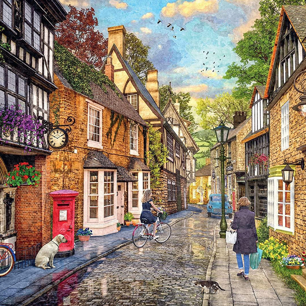This beautiful lane boasts a range of historic and picturesque houses. The buildings are all shapes, sizes and constructions; some are grand, others are simple cottages and most now seem to be shops or businesses of some kind. Residents potter from shop to shop along the glistening cobbled street; they are lucky to have avoided the recent rain shower! At the end of the lane we can see distant green hills, which explain the name of this oh-so-pretty street. This puzzle was inspired by the beautiful architecture to be found across the UK, and it’s packed with wonderful details for you to discover and enjoy.