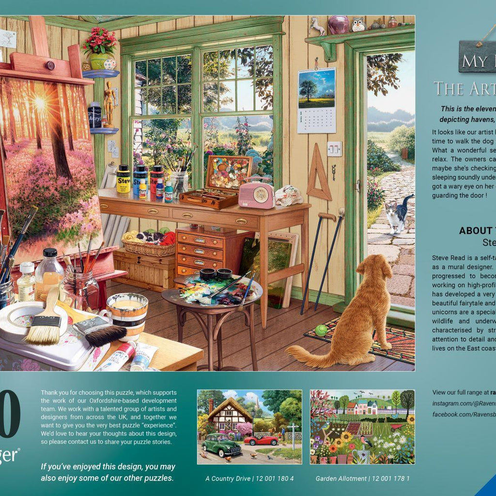 The Artist's Shed is a premium quality 1000-piece cardboard jigsaw puzzle is Number 11 in Ravensburger’s My Haven Collection.