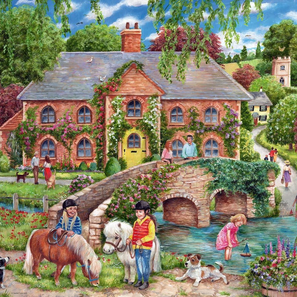 This captivating puzzle captures a tranquil village scene brimming with life and activity. Amidst the rolling green hills, you’ll find cozy cottages with thatched roofs, a quaint stone bridge arching over a gentle river, and friendly villagers going about their day. A young girl is sailing her toy boat on the river.