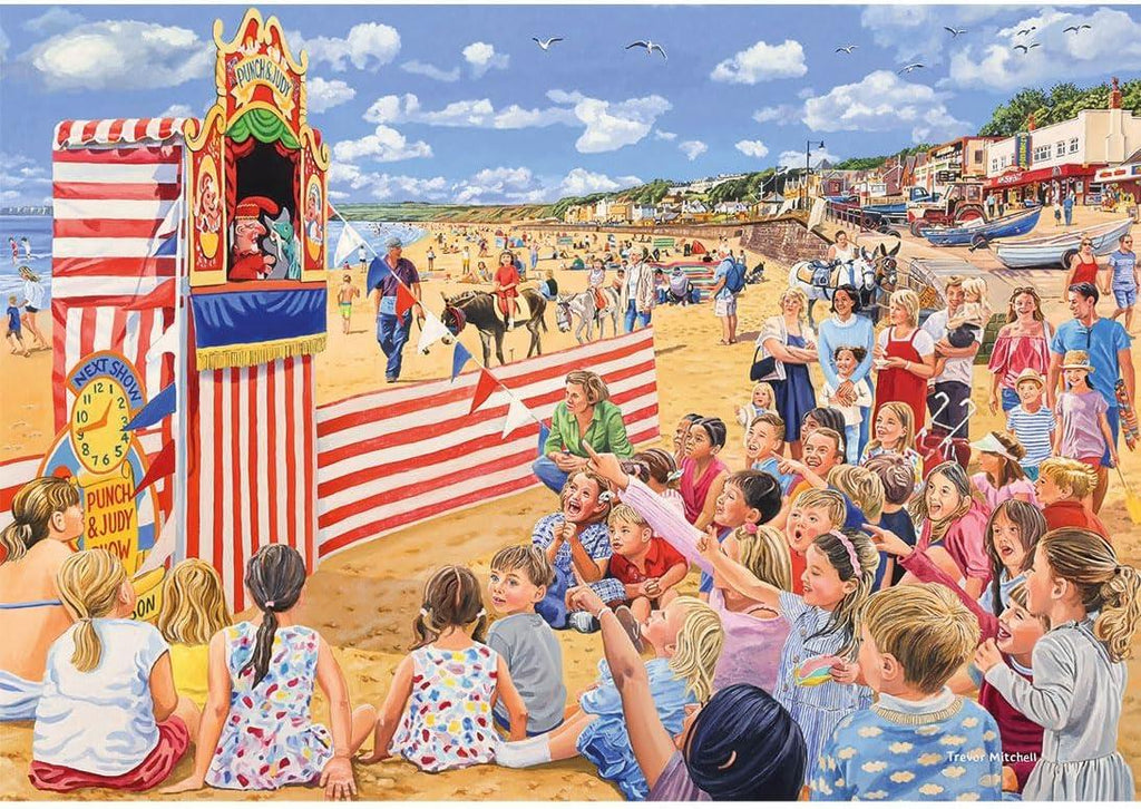 Relive precious memories of summers by the seaside in Trevor Mitchell’s timeless set of 4 jigsaw puzzles that tell the story of a family day trip to the beach. Start the day building a sandcastle by the edge of the water, then take in a show on the sand. When the tide comes in, enjoy a stroll on the promenade and a ride on the carousel before rounding off the day with fish and chips at the harbour. The perfect summer outing!