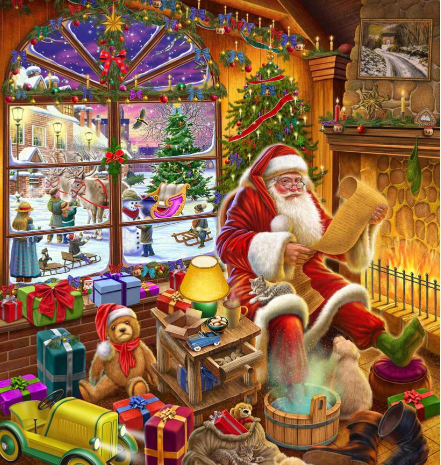 In this magical Christmas scene, we have an exclusive look inside Santa's cabin, where he is resting his feet and checking his list to make sure he's delivered all the presents to children across the world. The fire is roaring, there's a fresh cup of hot cocoa, and the pets are still snoozing on this beautiful Christmas morning.