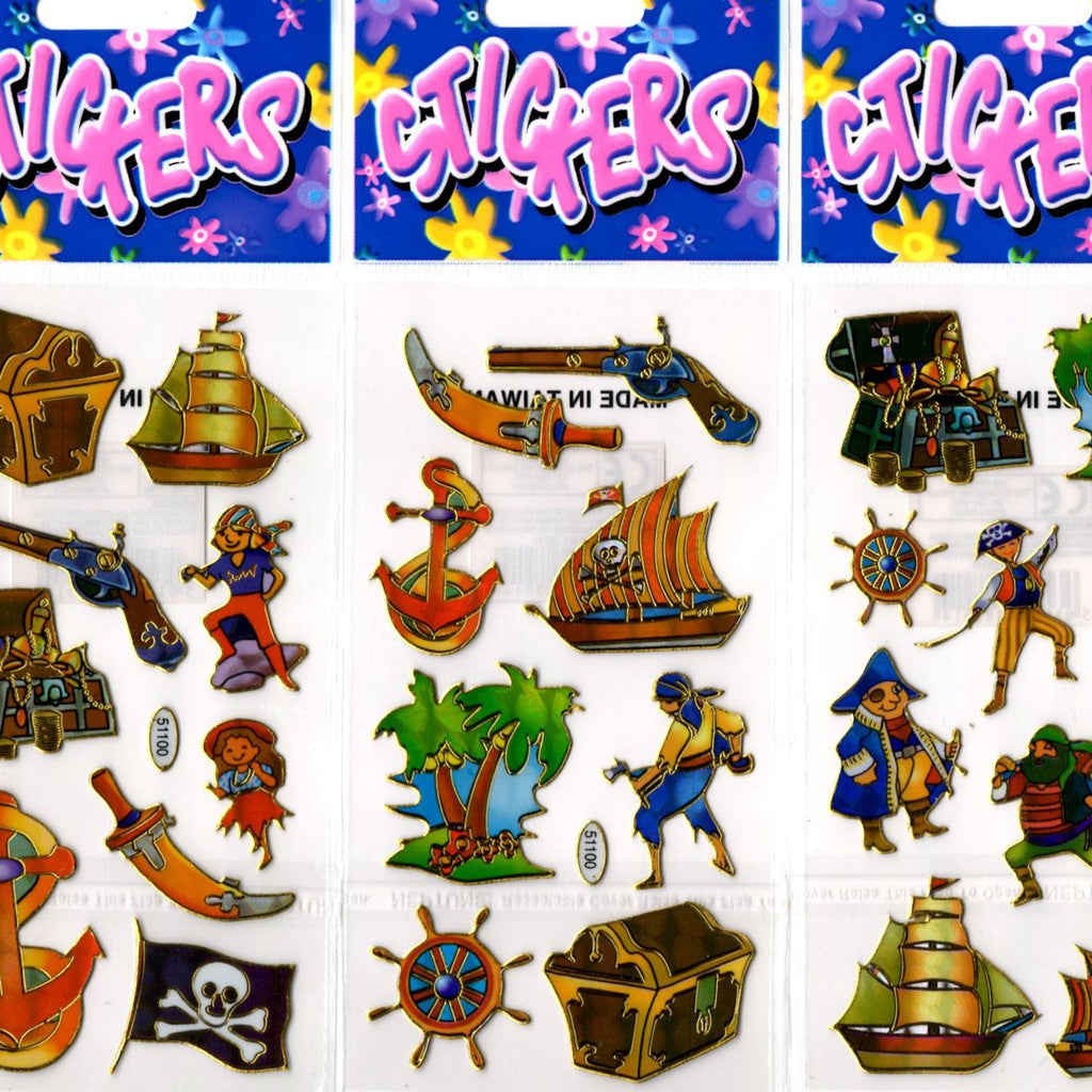 Each pack contains a sheet of around 9 stickers in assorted pirate designs. Sold in sets of 12 strips, these pirate stickers are a great value pocket money toy which children will love.