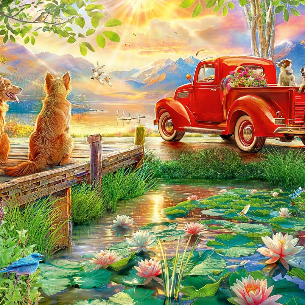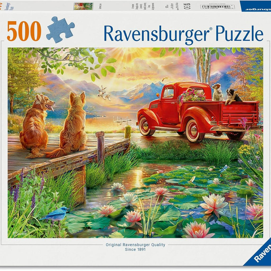 Forget all your worries and indulge in some self-care as you unwind with this heartwarming “Summer Love” Ravensburger 500-piece jigsaw puzzle. A vintage red truck holds a pair of happy dogs, basking in the warm sun as golden rays dance across the sky and sparkle over the water. Graceful swans glide across the still lake, while majestic mountains tower in the distance and delicate lotuses add an exotic touch of beauty.
