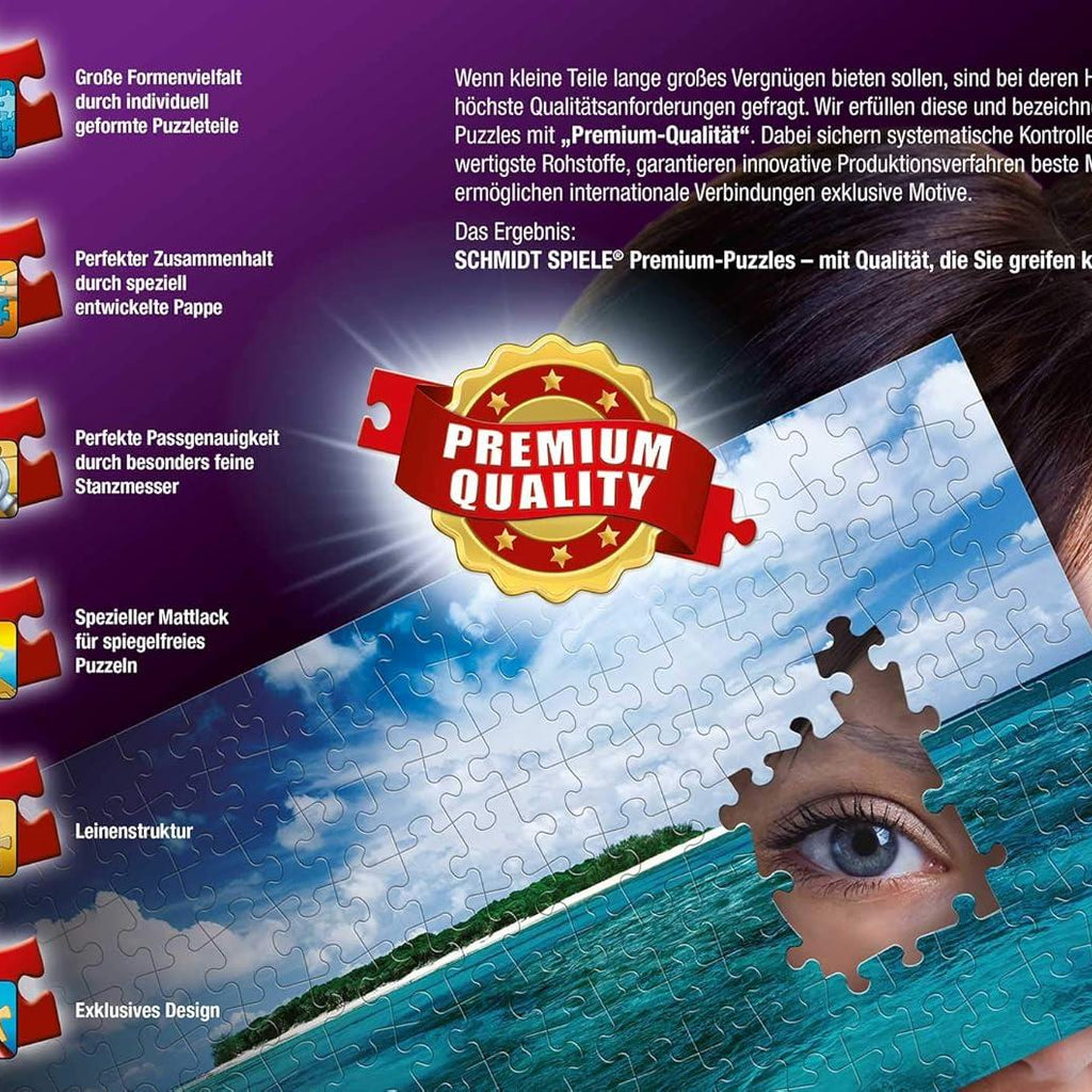 Combined, the quality and fit of Schmidt's six-star quality means that a 1,000 piece puzzle can be lifted up vertically once complete without the need of any puzzle conserver making this jigsaw a satisfying experience for any puzzle lover.