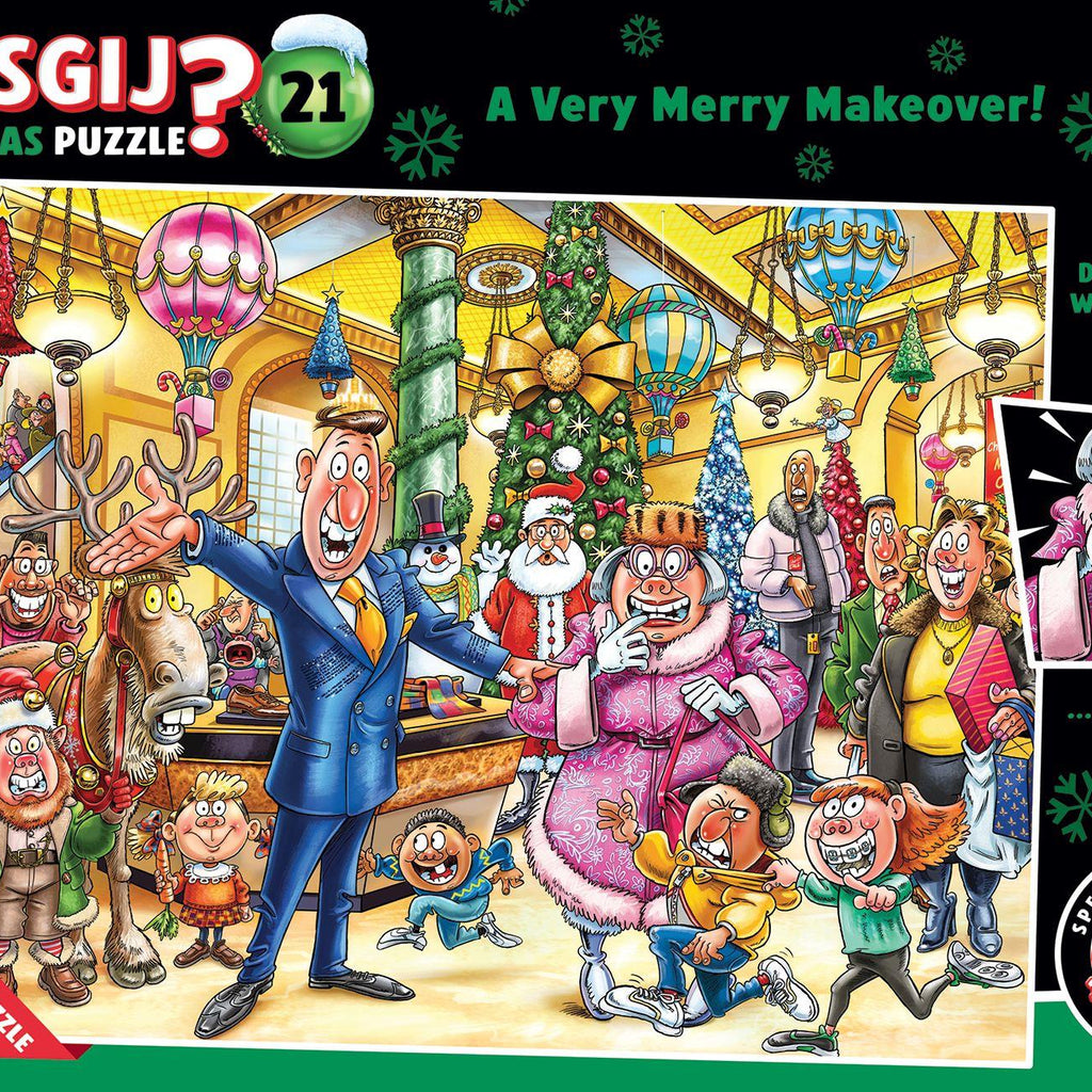 Wasgij Christmas 21 A Very Merry Makeover! contains two fantastic Christmas 1,000 piece jigsaw puzzles. You can enjoy piecing together the image printed on the box and the 'solution' image. So that's two fabulous Wasgij jigsaw puzzles in one box for the price of one!