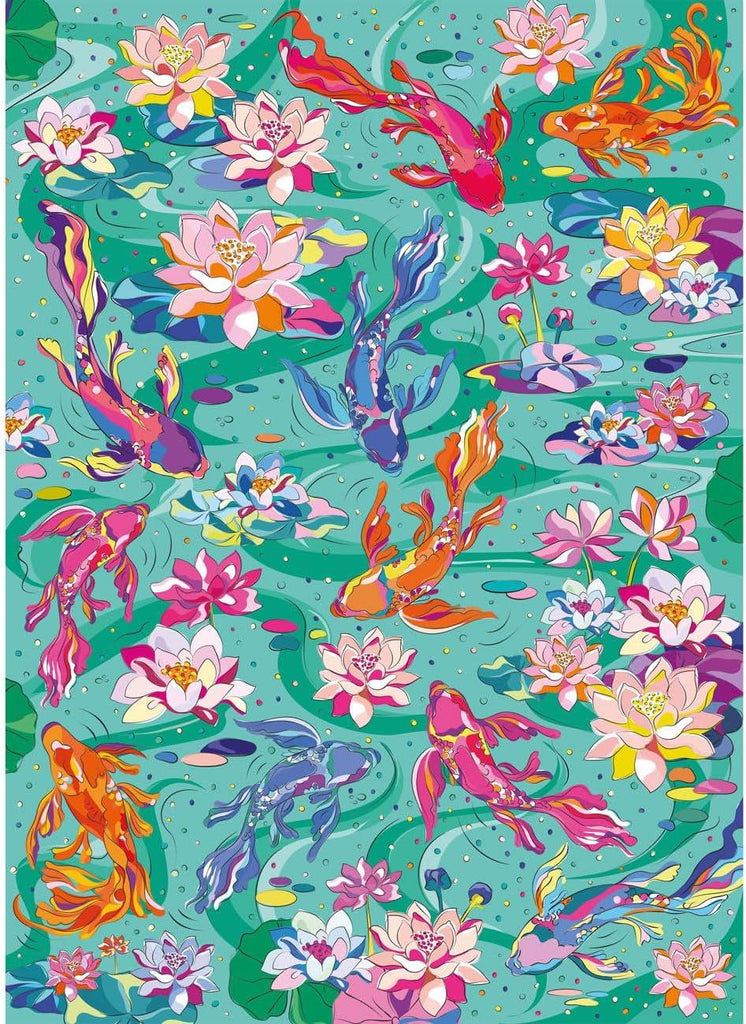 Dive into the peaceful beauty of Tranquil Waters, a vibrant 1000-piece jigsaw puzzle featuring a stylised koi pond filled with serene fish and blooming lilies.