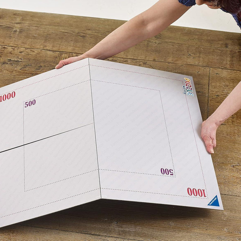 Assembly is simple: just unfold the board, and add plastic securing brackets on each side to make the board rigid and begin puzzling away! Puzzle Handy is printed on a neutral non-glare background colour, and includes dotted guidelines showing the finished sizes of Ravensburger's 500 and 1000 piece puzzles. It is also manufactured from FSC approved materials. Use the guidelines to help you ensure your puzzle is centrally located on the board, which can be a great help with the jigsaw building process. When you've finished your puzzle and want to put the Puzzle Handy away, just remove the securing brackets, refold the board and pop it back into the storage box provided!