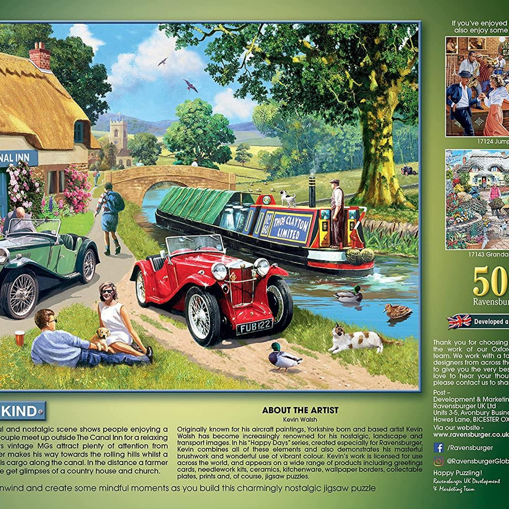 His and Hers vintage MGs star on this colourful nostalgic puzzle. It's a happy summer's day, and a couple meet up outside The Canal Inn for a relaxing drink. The pristine paintwork of their vintage MGs gleams in the sunlight; the gentleman's car is classic British Racing Green, the lady's vibrant Flame Red, and both attract attention from passers by. A keen walker makes his way towards the rolling hills, whilst a boatman skilfully pilots his cargo along the canal. In the distance we see a country house, church and a tractor working in the field.
